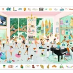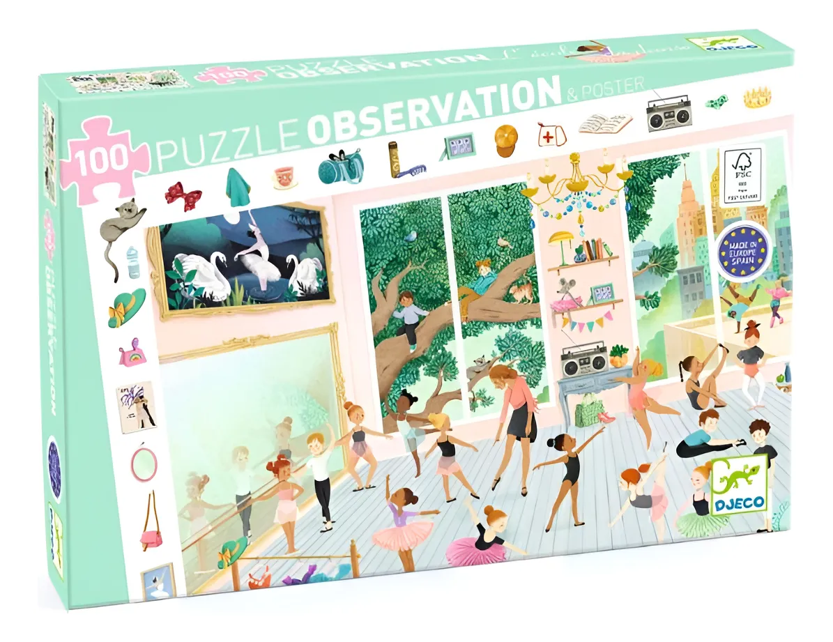 El Puzzle de Observación “The Dance School” de Djeco invita a los pequeños artistas a entrar en un mundo lleno de ritmo, elegancia y color. Cada pieza revela una historia dentro de esta encantadora escuela de danza, ¡donde los personajes se preparan para el gran espectáculo! 🎭