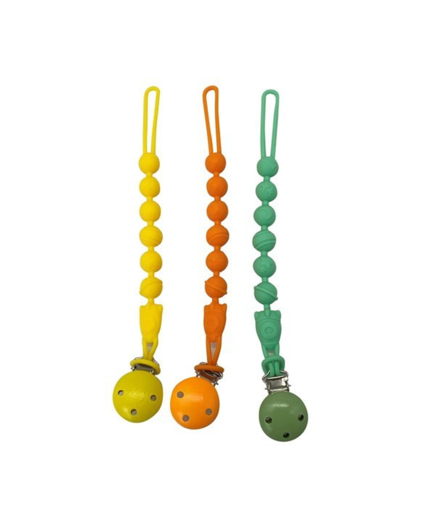 Fabricada en silicona flexible, esta cadena permite sujetar el chupete a la ropa evitando caídas o pérdidas durante paseos y actividades diarias.