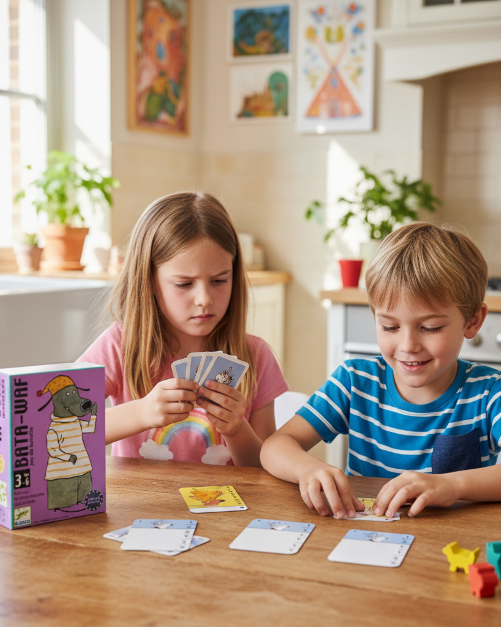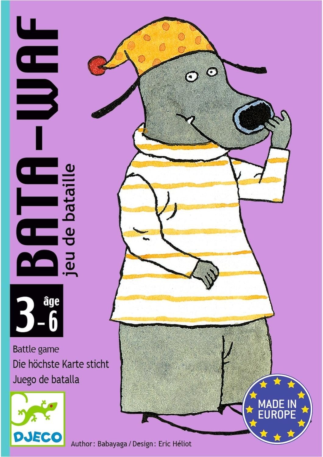 Presentamos Bata-Waf, el clásico juego de cartas de Djeco ideal para los pequeños estrategas. En cada ronda, los jugadores muestran la carta de su “perro” y el más grande se lleva todas. Pero ¡ojo! cuando hay empate… llega el famoso Bata-Waf. 🐕🦺