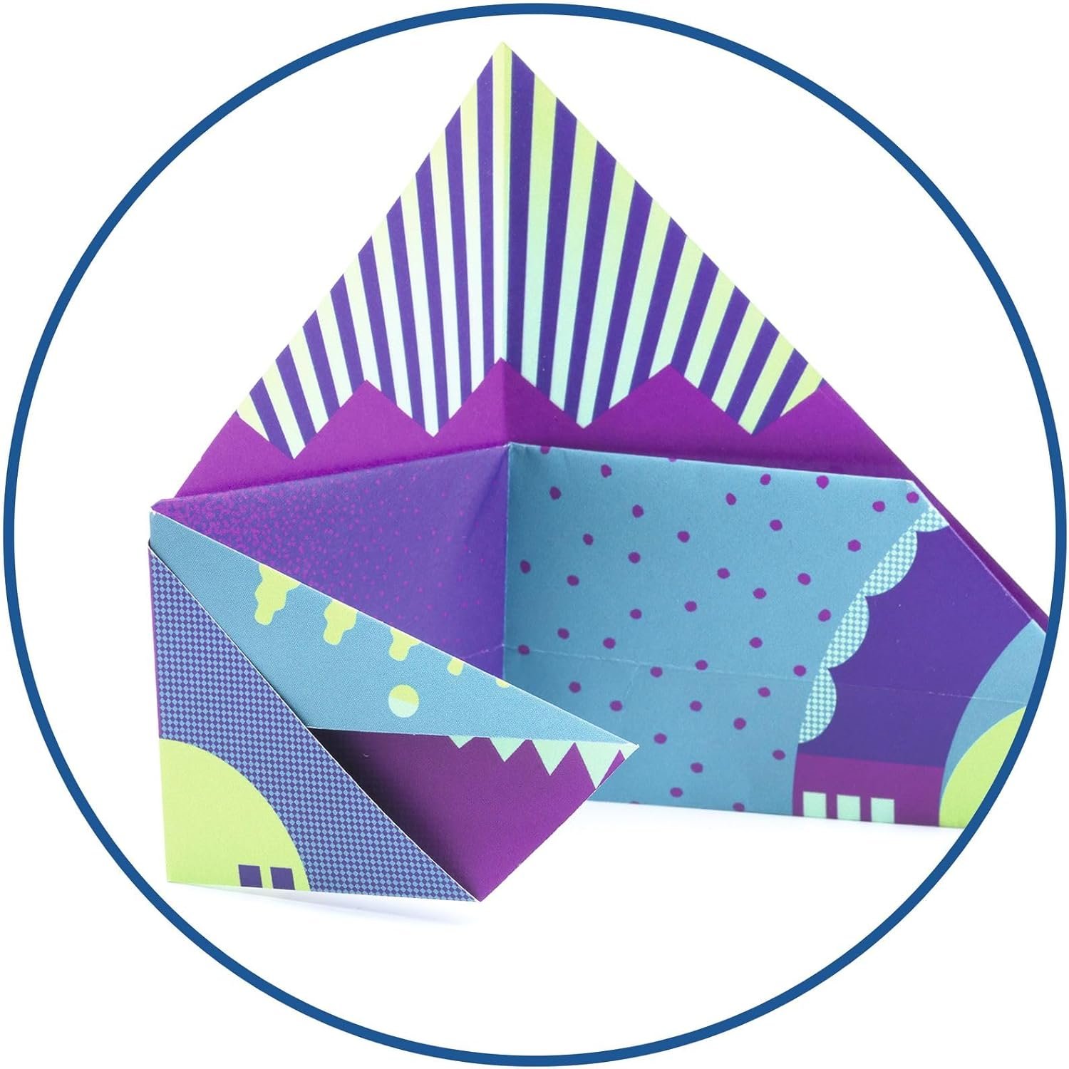 Siguiendo las líneas marcadas y las instrucciones del folleto ilustrado, los niños aprenderán paso a paso a plegar 24 dinosaurios de papel con increíbles reflejos fluorescentes.
