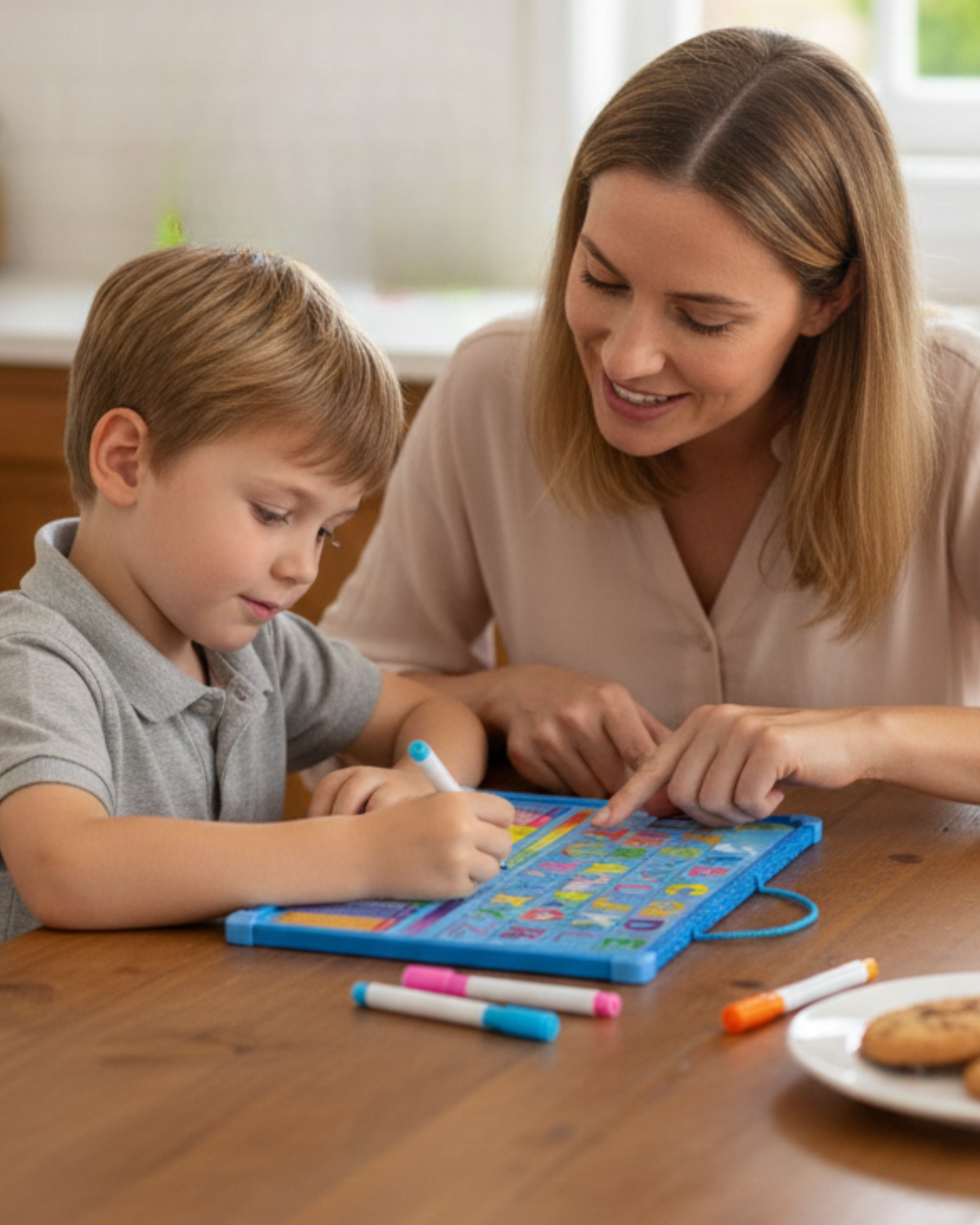 Al dorso se incluye abecedario en imprenta mayúscula y las tablas de multiplicar hasta el 12.