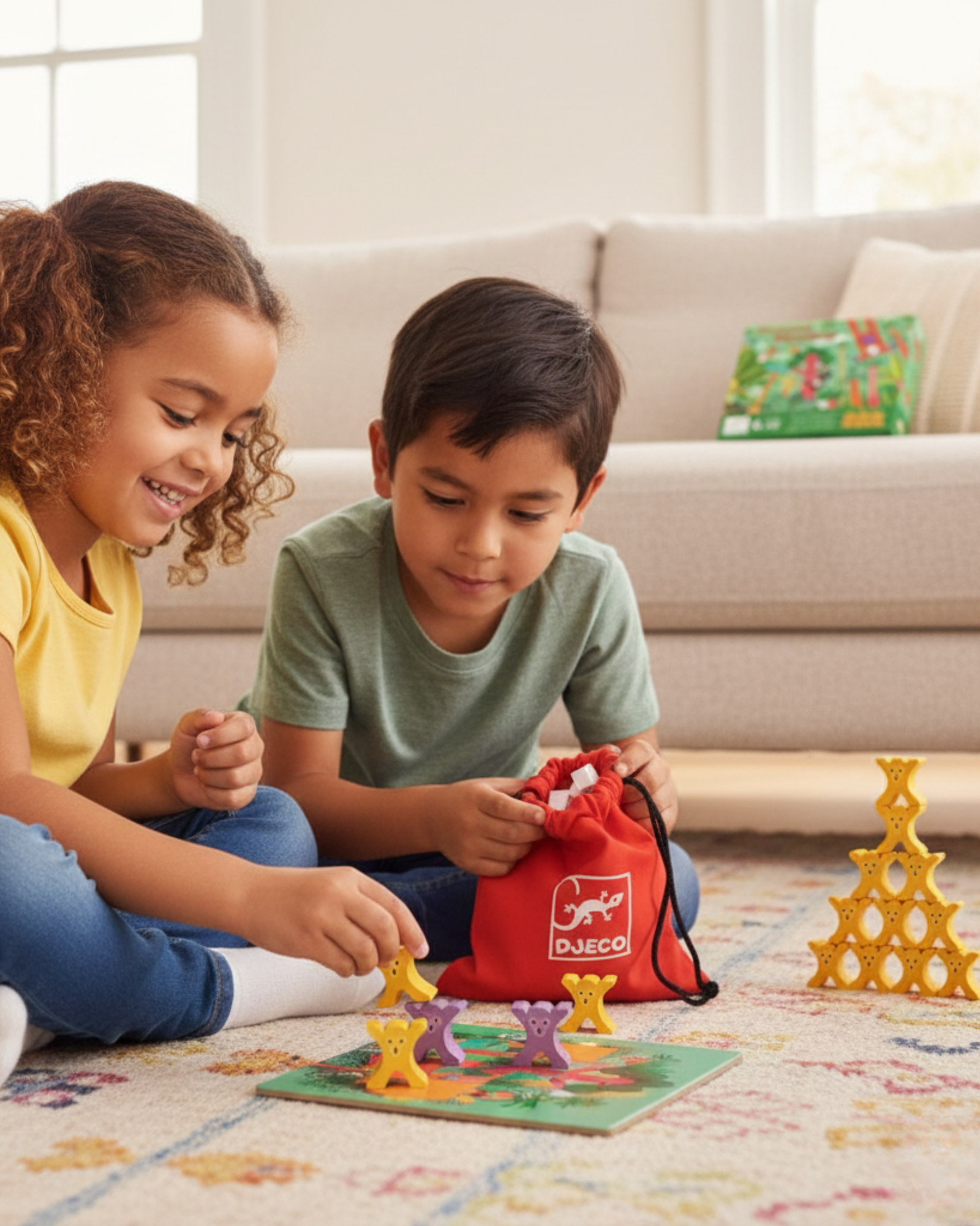 Con Pyramid Monkey de Djeco, cada jugador construye una torre balanceando monos de madera uno sobre otro. El desafío: ¡no dejar que se caiga!